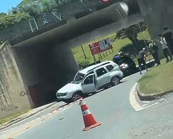 Um acidente marcou o início da tarde desta sexta-feira (5), em Blumenau. Um veículo Renault Duster despencou do viaduto da Dudalina, na BR-470, caindo na