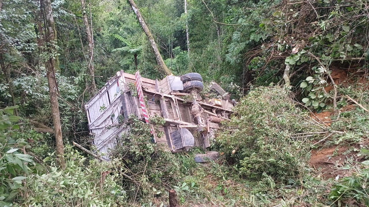 Um motorista de 64 anos ficou preso às ferragens após o caminhão que ele dirigia, um Ford F-4000, sair da pista e despencar em uma