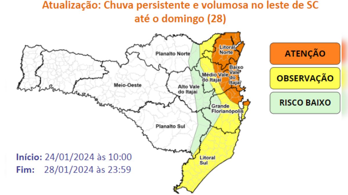 Entre quinta (25) e sexta-feira (26), espera-se chuva persistente ao longo do litoral, com acumulados variando entre 30 e 50 milímetros. No final de semana, o clima permanecerá instável, com a chuva ganhando intensidade e podendo superar os 100 milímetros, especialmente nas áreas do Baixo Vale do Itajaí, Grande Florianópolis e parte do Litoral Sul.