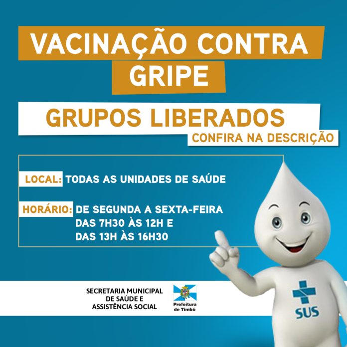 A Secretaria de Saúde de Timbó inicia nesta semana a Campanha Nacional de Vacinação contra a gripe (Influenza). Confira abaixo os grupos que já estão liberados para tomar a vacina.