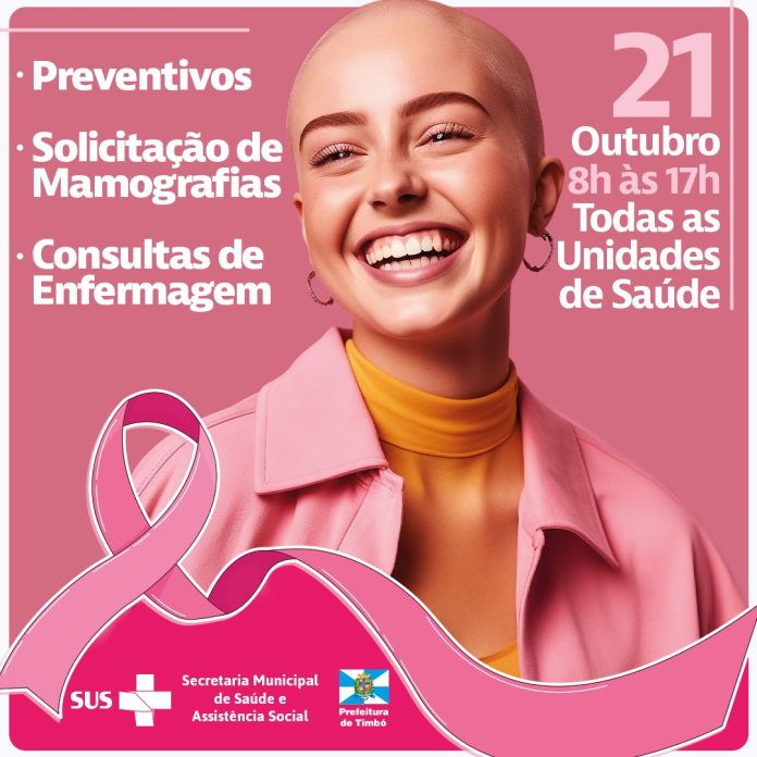 Estamos no Outubro Rosa, um mês de conscientização para prevenção e diagnóstico precoce do câncer de mama. Por isso, entre as ações promovidas pelo município, neste sábado, dia 21 de outubro, todas as Unidades de Saúde aqui de Timbó estarão abertas realizando exames preventivos, consultas de enfermagem e agendando mamografias.