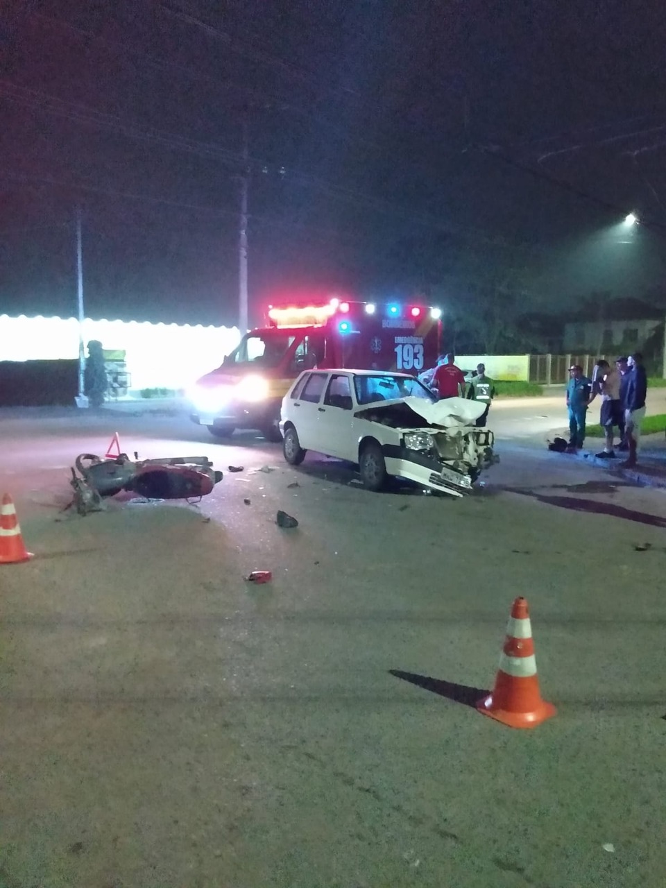 Por volta das 5h da manhã de hoje (22), o Corpo de Bombeiros Militar foi acionado para atender uma colisão envolvendo um carro FIAT UNO e uma moto HONDA BIZ, na Rua Fritz Lorenz, bairro Industrial.