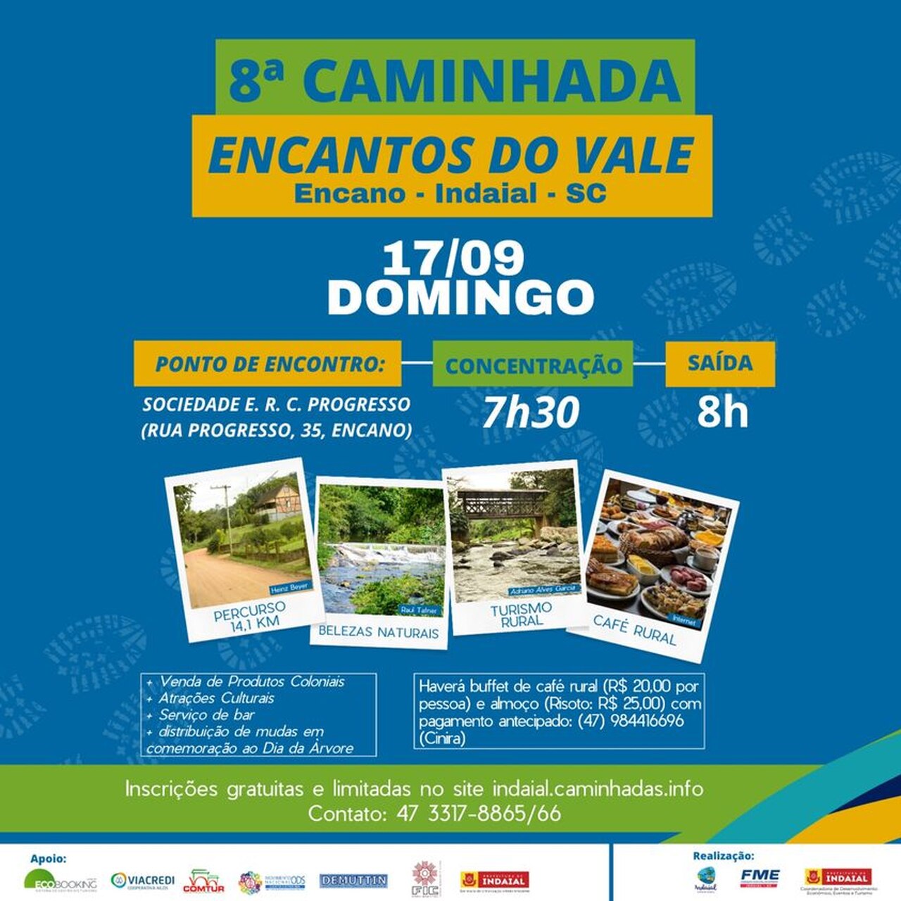 A tão aguardada Caminhada Encantos do Vale, em Indaial, já tem data para acontecer. O evento será no dia 17 de setembro, domingo, na região do Encano, umas das áreas mais lindas e abundantes em natureza da cidade. Os participantes realizarão um percurso de 14,1 km por estradas de chão batido margeadas pelo ribeirão e belezas naturais, passando por edificações de acentuado valor histórico, além de paisagens rurais características da região.