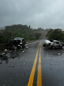Duas pessoas ficaram feridas em uma colisão frontal na manhã desta segunda-feira (01), no km 86,9 da BR-470, na ponte que divide os municípios de
