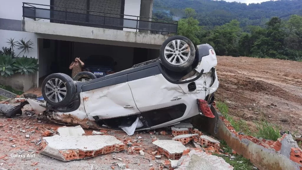 Um carro perdeu o controle e chocou-se com um muro antes de capotar na rodovia SC-110, na cidade de Rodeio.