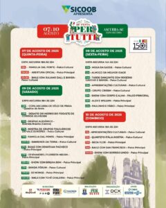 A festa começa na quinta-feira (7), com abertura oficial no Palco Principal e apresentações culturais como a Famiglia Dal Ponte. Na sexta-feira (8), o destaque fica para o tradicional Almoço da Melhor Idade, a Missa da Saúde e uma sequência de shows, com Corpo e Alma, Alex & Willian e Paulinho & Fábio agitando a noite.
