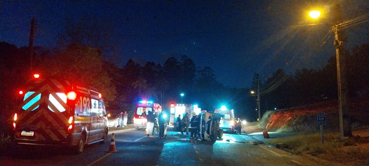 O primeiro chamado ocorreu por volta das 4h22, na BR-470, km 108. Uma colisão entre um carro e um ônibus deixou dois feridos. No coletivo, que transportava 22 ocupantes, apenas uma passageira adulta foi avaliada, mas recusou transporte ao hospital. Os demais não apresentaram ferimentos ou queixas.