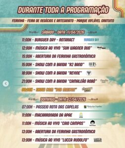 Entre as atrações confirmadas estão Burger Day, macarronada da APAE, feira gastronômica, feira de negócios e artesanato, além de parque inflável gratuito para as crianças.