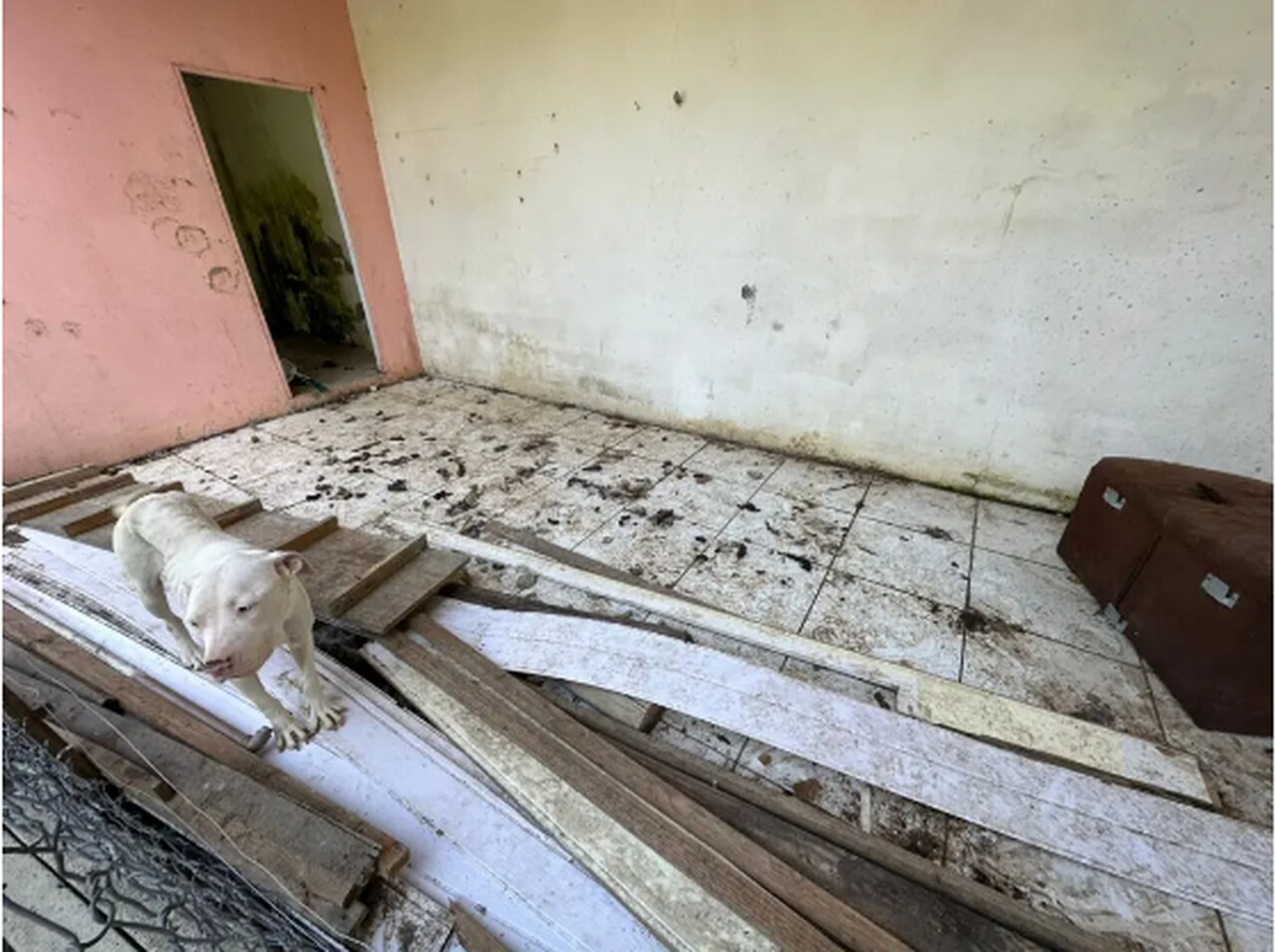 O cão foi encontrado em condições visíveis de desnutrição e debilidade. Ele estava sem acesso a comida ou água, enfrentava dificuldades para se movimentar, estava infestado de parasitas e vivendo em um ambiente sujo, repleto de fezes.